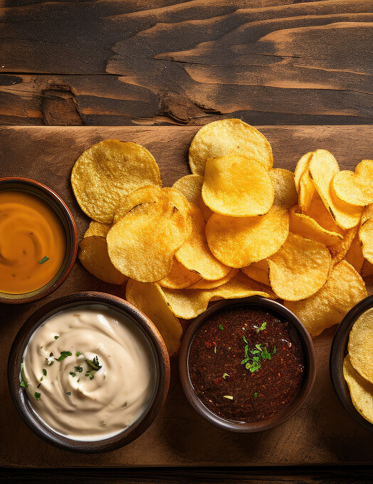 A perfect pairing of crispy, freshly made chips and rich, flavorful dips that bring a burst of taste in every bite.